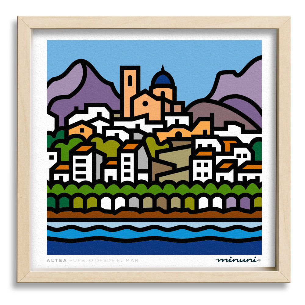 The Series consists of nine sheets of graphic work: The Marina of Alicante, The View from the Castle of Santa Bárbara, The Paseo de la Explanada, The Basilica of Santa María, The Hanging Houses of Villajoyosa, The Streets of Altea, Altea view from the Mediterranean, the city of Benidorm from the East and from the West, the Island of Tabarca and Calpe Beach.